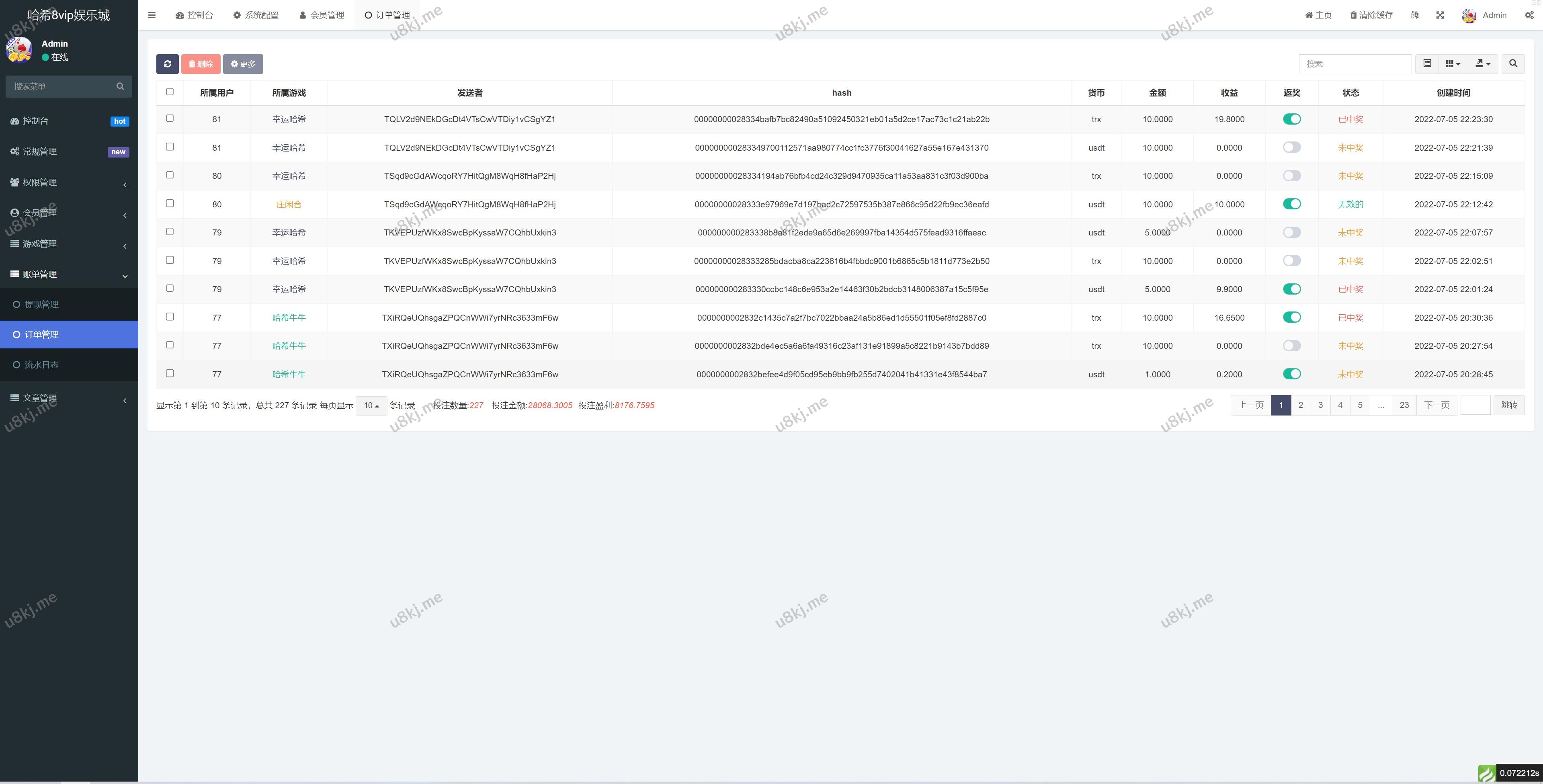 支持限额返款(后台设定中奖金额,中奖金额超额手动打款,例如你设置的1000限额 有人投注了1500 中奖了。那是不自动返奖的,这时候返奖按钮是没有开的, 需要手动开一下 标记是否返款)