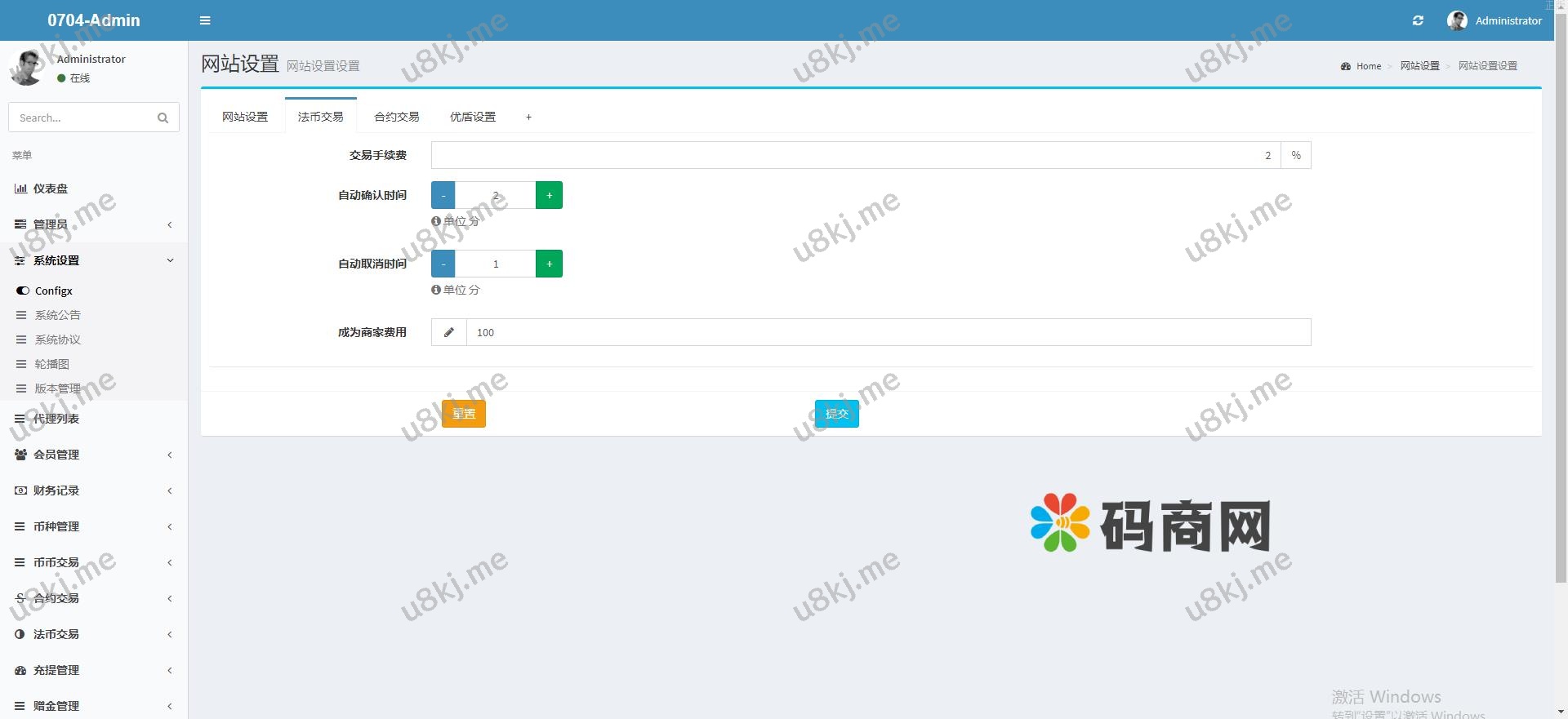 法币交易(商家管理、订单管理、收款信息、日志管理、划转记录,交易手续费,自动确认、取消时间,成为OTC商家费用);