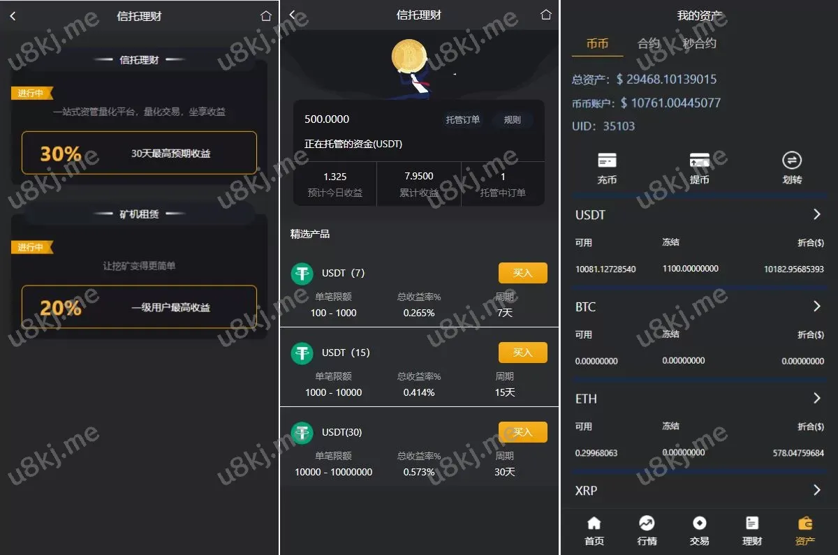 这套源码适合需要多功能 交易所 和 理财 服务的平台,支持 秒合约交易 和 借贷功能,同时提供 闪兑 和 矿机认购 等附加功能。