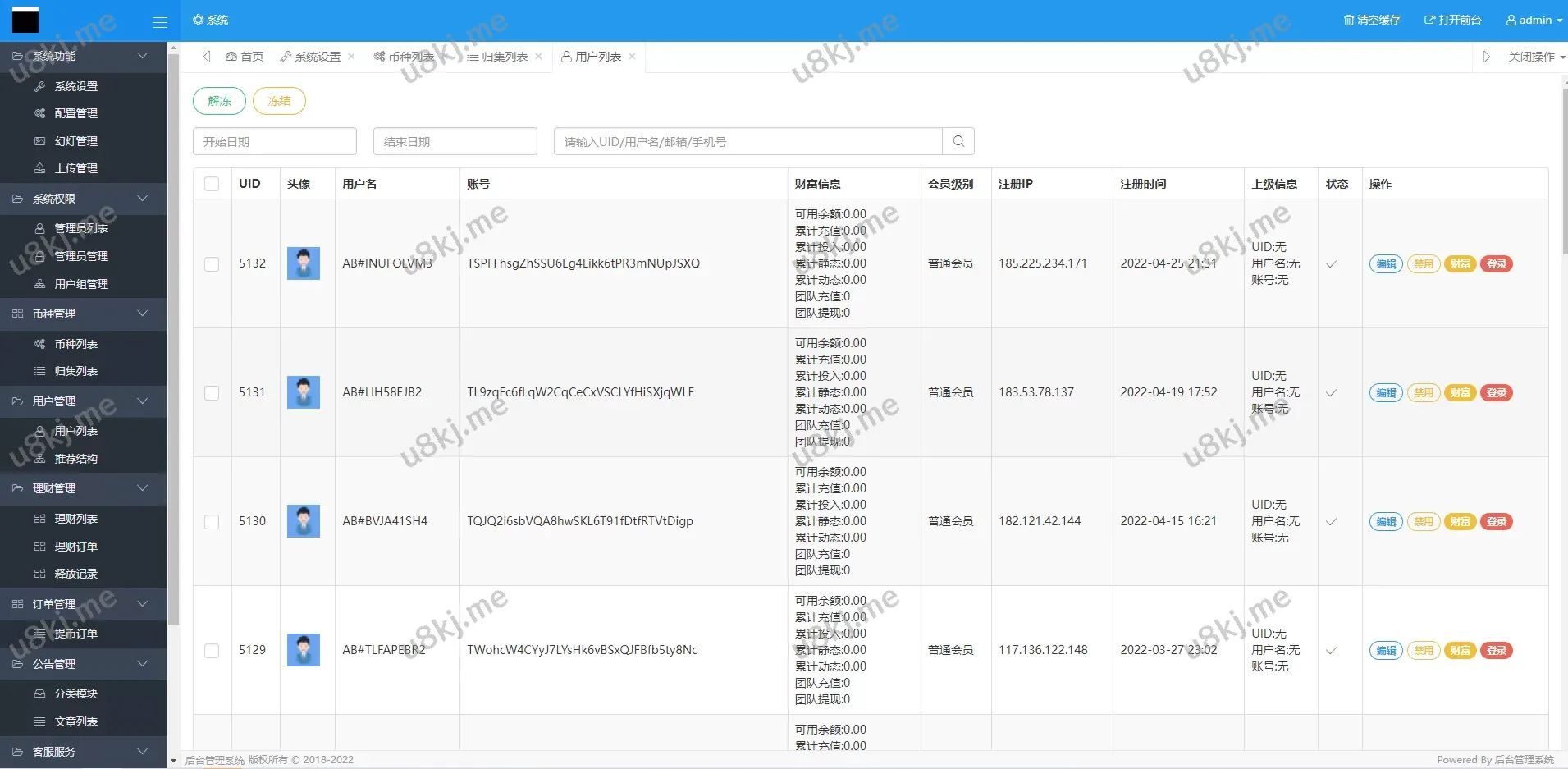 用户管理:由于链上授权登录用户无账号密码,后台支持一键登录,可查看用户信息,