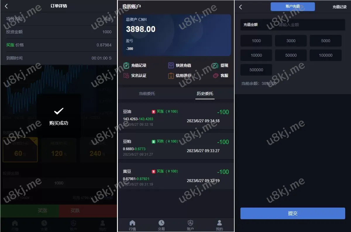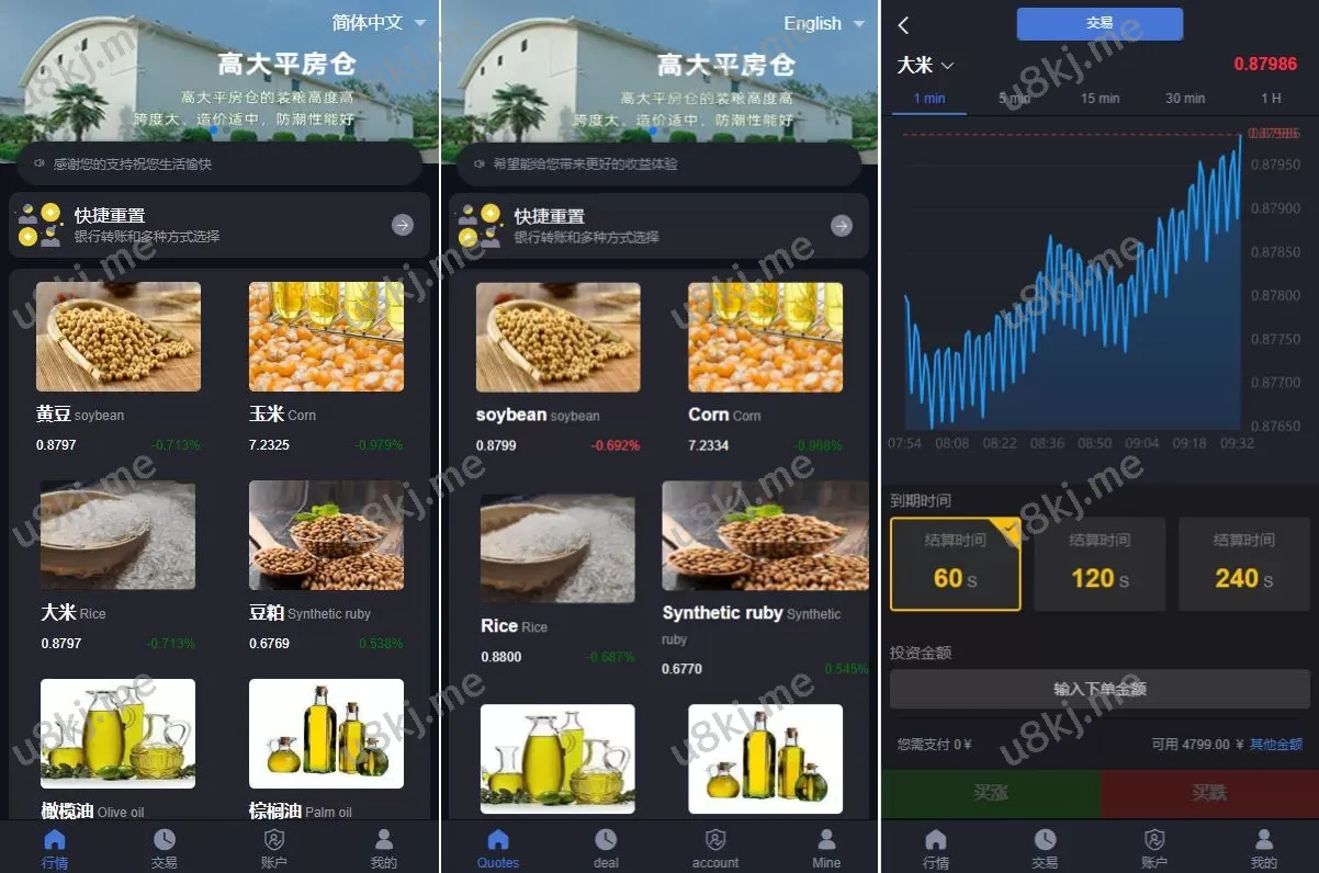 修复版微交易源码/粮食微盘源码/双语言微盘交易源码 🌟 主要功能亮点 🌟 ✅ 前端UI二次开发优化:二开美化展示界面,用户体验更佳✅ 双语言支持:默认双语言,可二开扩展其他语言✅ 简洁高效的前端功能:操作流畅,界面清爽✅ K线图美观:优化K线UI,数据展示更直观✅ 用户信用分可调:后台可随时修改用户信用评分✅ 源码开源可二开:适合个性化定制开发 📌 适合搭建微交易、期货、粮食等交易平台,源码源码稳定可扩展! 微盘源码